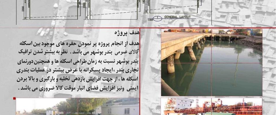 هدف از انجام پروژه پر نمودن حفره های موجود بین اسکله کالای عمومی بندر بوشهر می باشد. نظر به بیشتر شدن ترافیک بندر بوشهر نسبت به زمان طراحی اسکله ها و همچنین دورنمای تجاری بندر،